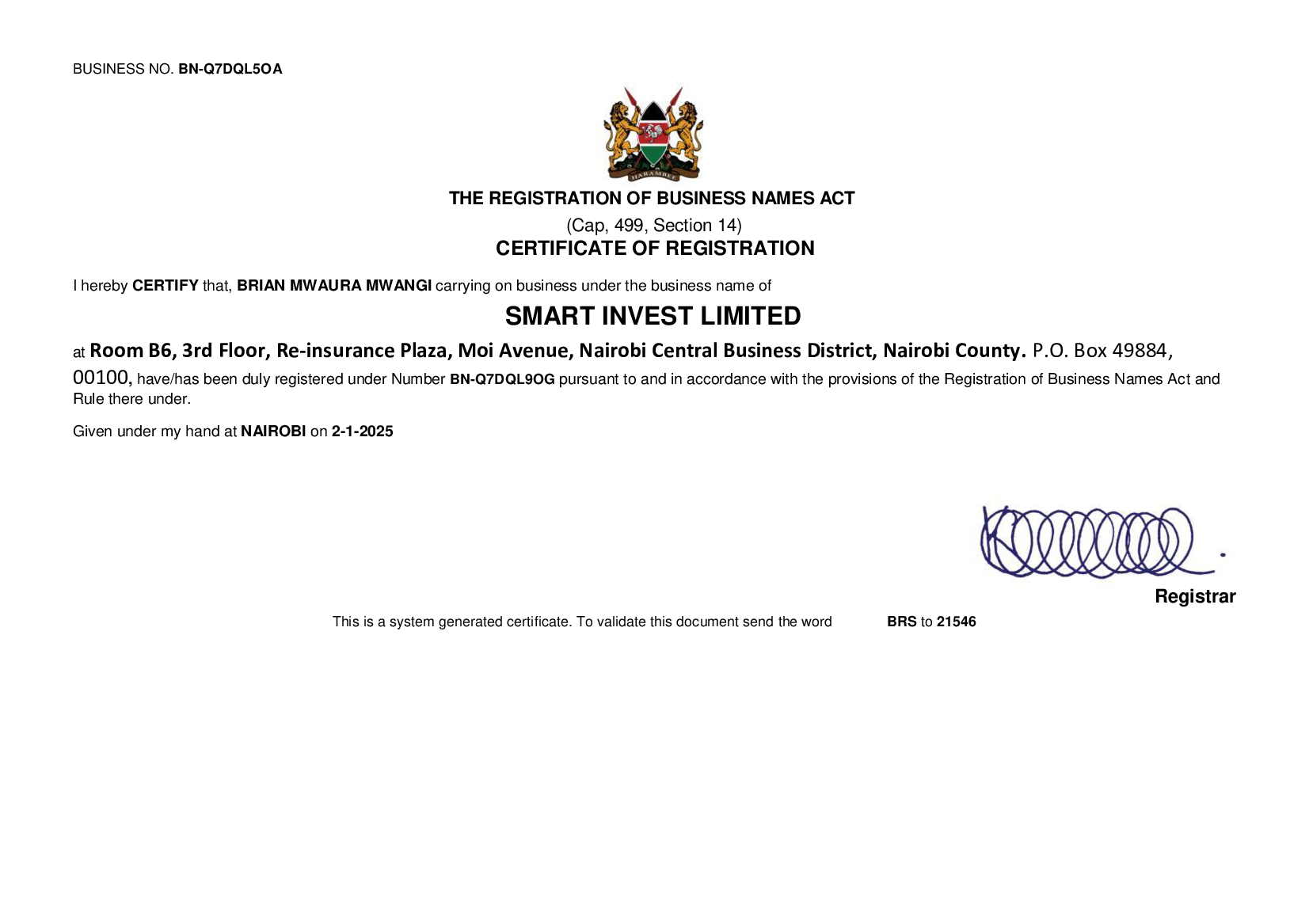 Smart Invest operates with complete transparency and strict adherence to regulatory requirements. The certificates below validate our legal status and authorization to provide financial services.